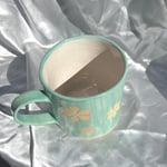 Hand built stoneware aqua ceramic mug with retro stenciled design